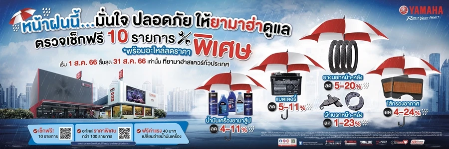 บริษัท ไทยยามาฮ่ามอเตอร์ จำกัด ผู้ผลิตและจำหน่ายรถจักรยานยนต์ยามาฮ่า จัดแคมเปญต้อนรับหน้าฝนกับโปรโมชั่นสุดพิเศษ Yamaha Rainy Campaign 2566 เพื่อสร้างความปลอดภัยให้กับรถจักรยานยนต์ยามาฮ่าของลูกค้าในทุกการเดินทาง เริ่มตั้งแต่วันที่ 1-30 สิงหาคม 2566