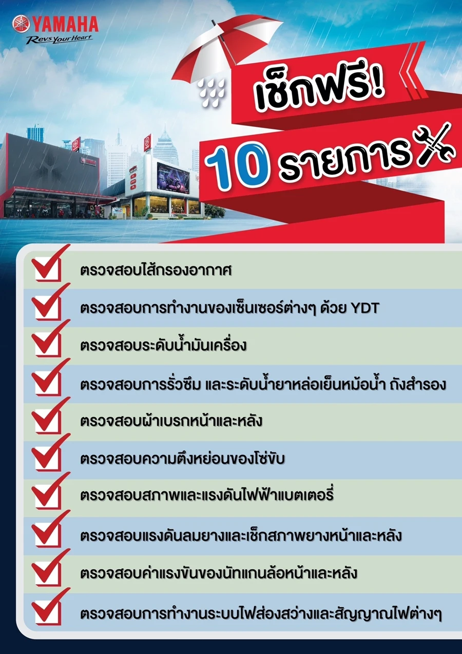 สำหรับโปรโมชั่น Yamaha Rainy Campaign 2566 นี้ เมื่อลูกค้านำรถจักรยานยนต์ยามาฮ่าทุกรุ่นเข้าศูนย์บริการยามาฮ่าสแควร์ทั่วประเทศ จะได้รับการตรวจเช็กฟรี! 10 รายการ คือ ตรวจสอบไส้กรองอากาศ, ตรวจสอบการทำงานของเซ็นเซอร์ต่างๆ ด้วย YDT, ตรวจสอบระดับน้ำมันเครื่อง, ตรวจสอบการรั่วซึมและระดับน้ำยาหล่อเย็นหม้อน้ำ ถังน้ำมันสำรอง, ตรวจสอบผ้าเบรกหน้าและหลัง, ตรวจสอบความตึงหย่อนของโซ่ขับ, ตรวจสอบสภาพและแรงดันไฟฟ้าแบตเตอรี่, ตรวจสอบแรงดันลมยางและเช็กสภาพยางหน้าและหลัง, ตรวจสอบค่าแรงขันของนัทแกนล้อหน้าและหลัง และตรวจสอบการทำงานระบบไฟส่องสว่างและสัญญาณไฟต่างๆ