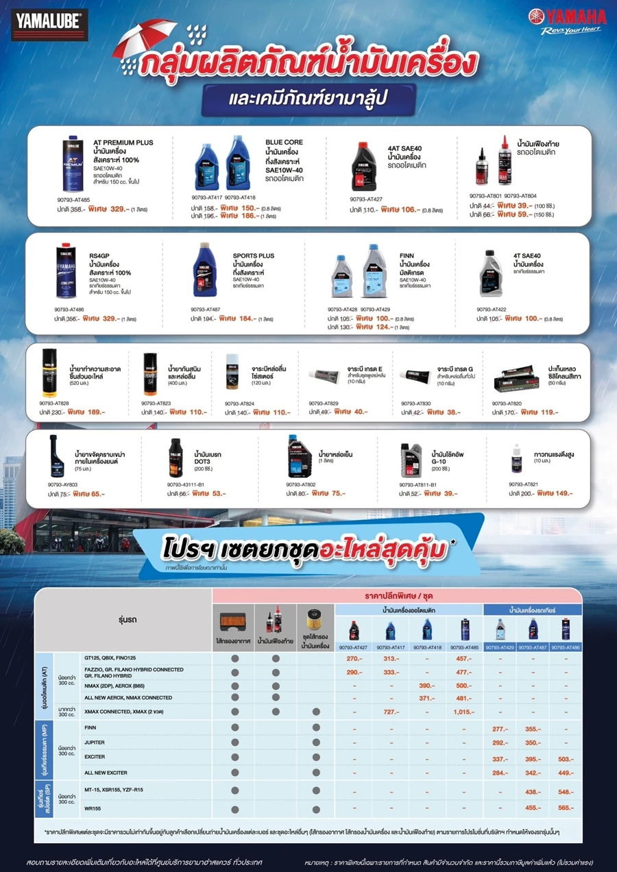 พร้อมทั้งอะไหล่แท้ราคาพิเศษจากยามาฮ่ามากกว่า 100 รายการ และโปรโมชั่นแบบเซ็ตยกชุดอะไหล่สุดคุ้ม ลดราคาพิเศษ 15-20% สำหรับรถรุ่นออโตเมติก (น้ำมันเครื่องยามาลู้ป ไส้กรองอากาศ และน้ำมันเฟืองท้ายที่ร่วมรายการ) และสำหรับรถรุ่นเกียร์ธรรมดาและสปอร์ต (น้ำมันเครื่องยามาลู้ป ไส้กรองอากาศ และไส้กรองน้ำมันเครื่องที่ร่วมรายการ)