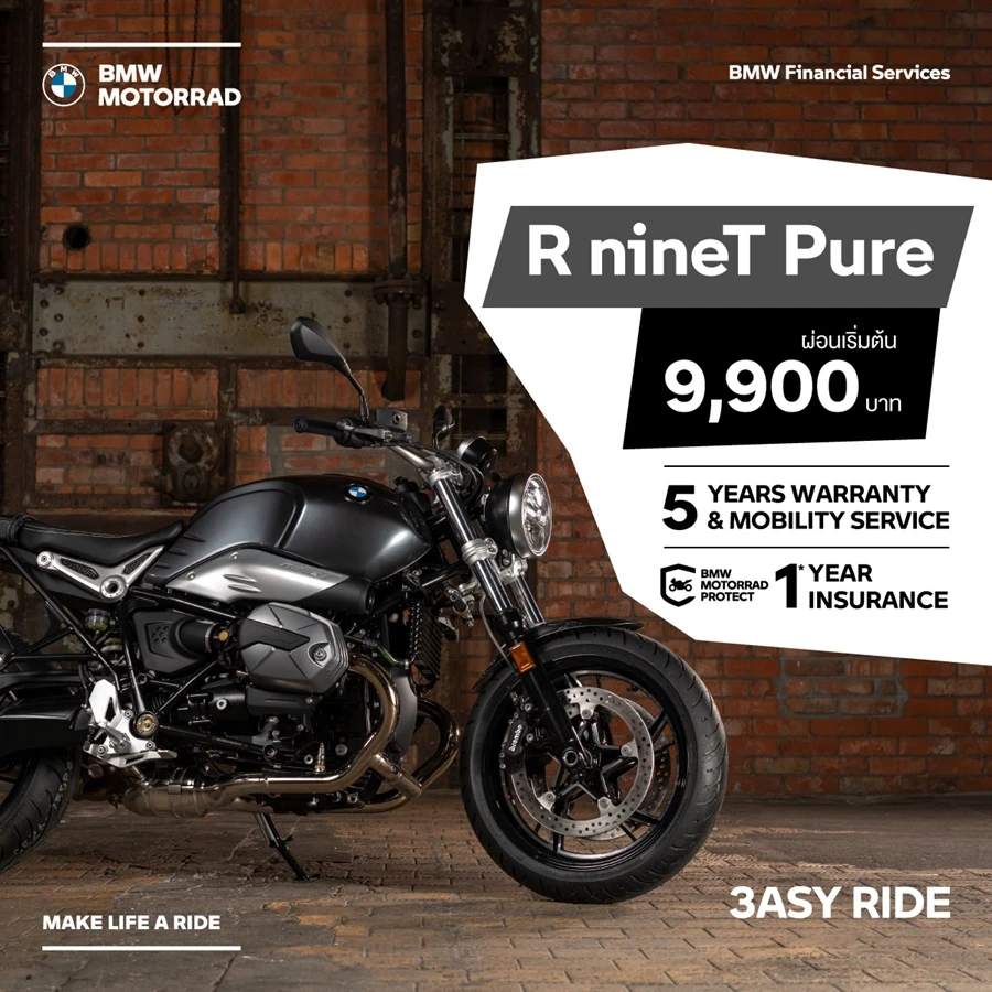 ส่งต่อจิตวิญญาณแห่ง BMW Motorrad กับเครื่องยนต์ Boxer ที่ทรงพลัง แต่มอบการขับขี่ที่นุ่มนวล พร้อมดีไซน์อันเป็นเอกลักษณ์ กับ BMW R nineT Pure ในราคาเริ่มต้นที่ 739,000 บาท ดาวน์เริ่มต้น 147,800 บาท* ผ่อนเริ่มต้น 9,900 บาท/เดือน* พร้อมข้อเสนอสุดคุ้ม