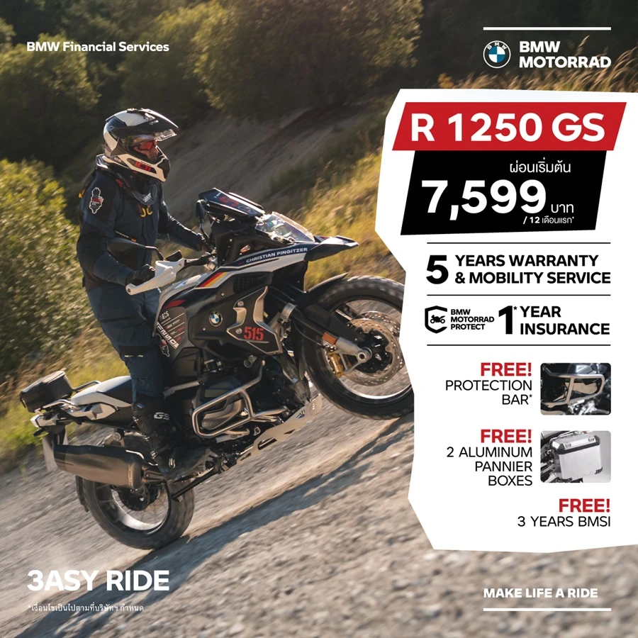 The New BMW R 1250 GS พร้อมพาคุณข้ามผ่านทุกอุปสรรคได้อย่างง่ายดาย และเติมเต็ม #SpiritOfGS ให้กับนักผจญภัยตัวจริงเช่นคุณ เป็นเจ้าของวันนี้ ในราคาเริ่มต้นที่ 1,075,000 บาท ดาวน์เริ่มต้น 215,000 บาท* ผ่อนเริ่มต้น 7,599 บาท/12 เดือนแรก* พร้อมข้อเสนอสุดคุ้ม