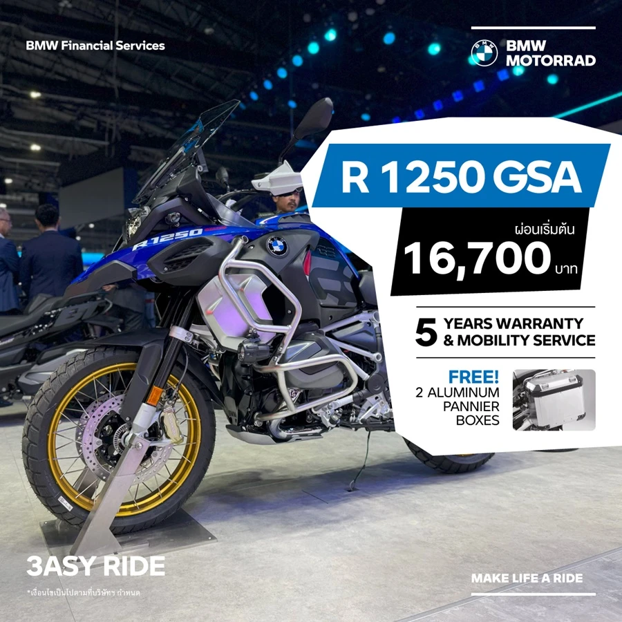 หมายเหตุ: ข้อเสนอนี้พิเศษสำหรับลูกค้าที่จองรถบีเอ็มดับเบิลยู มอเตอร์ราด พร้อมทำสัญญาทางการเงินที่ร่วมรายการกับ บีเอ็มดับเบิลยู ไฟแนนเชียล เซอร์วิส ประเทศไทย ตั้งแต่วันนี้ –31 มกราคม 2567 และรับรถภายในวันที่ 31 มกราคม 2567 บริษัทฯ ขอสงวนสิทธิ์ในการเปลี่ยนแปลงเงื่อนไข และข้อกำหนดต่างๆ โดยมิต้องแจ้งให้ทราบล่วงหน้า