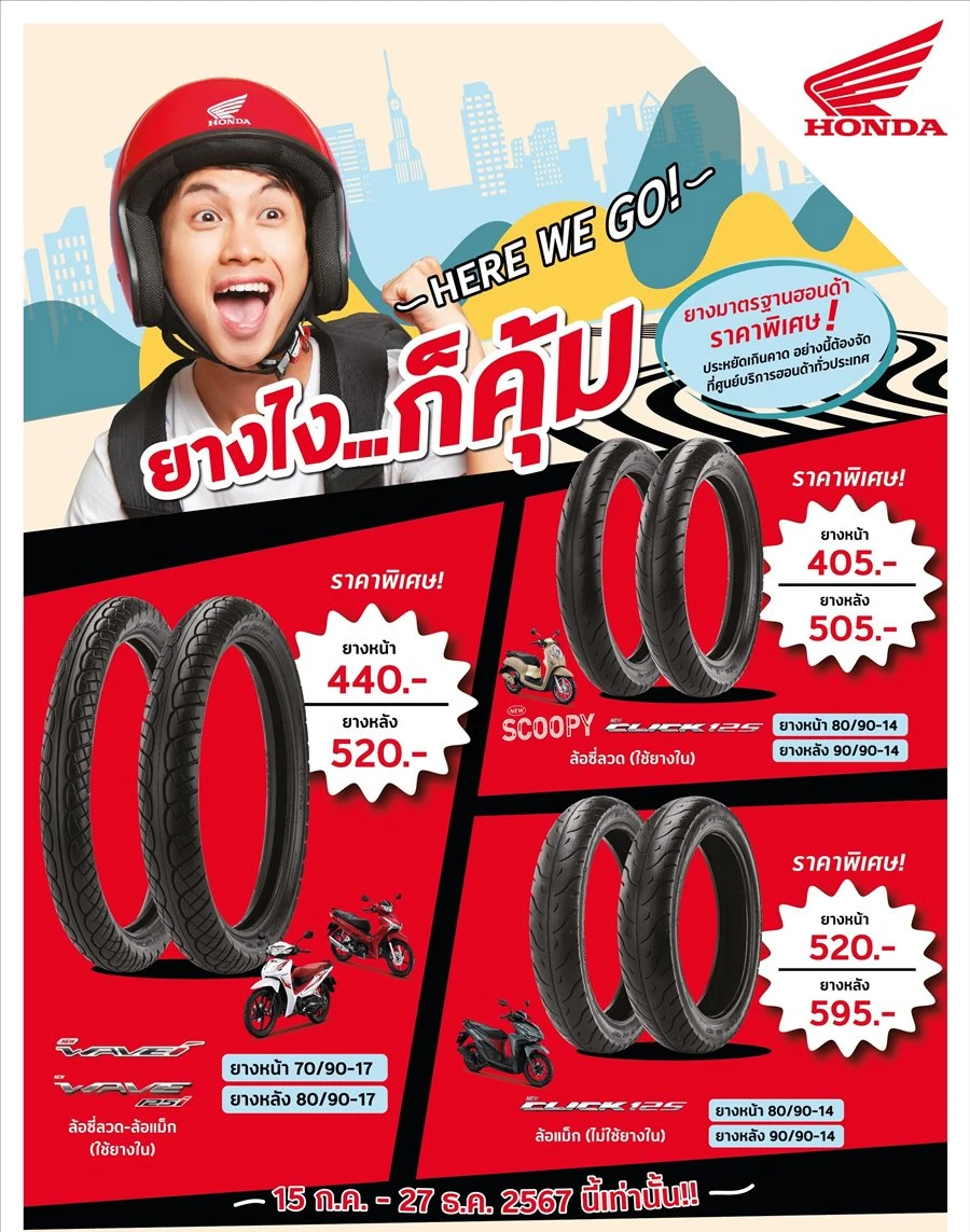 ไทยฮอนด้า ชวนผู้ขับขี่รถจักรยานยนต์ตรวจเช็กสภาพยาง เพื่อช่วยลดอัตราการเกิดอุบัติเหตุในช่วงหน้าฝน พร้อมมอบโปรโมชันและราคาพิเศษสุดคุ้มสำหรับผู้ที่ต้องการเปลี่ยนยาง โดยมอบความคุ้มยาวๆ ตั้งแต่ 15 กรกฎาคม – 27 ธันวาคม นี้