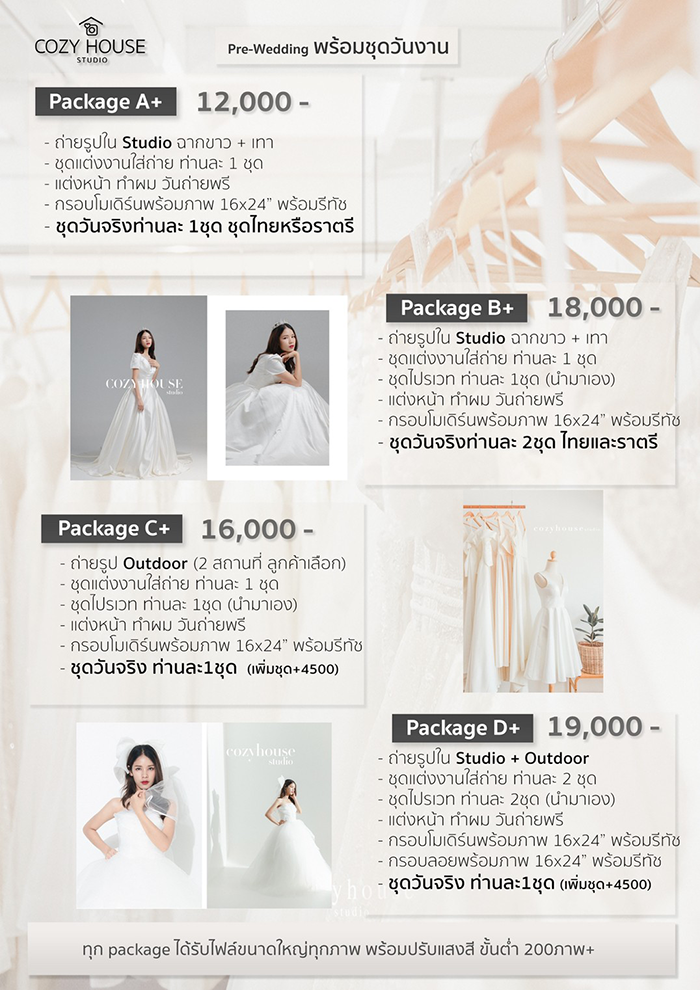 ซึ่งราคาของแต่ละแพคเกจก็จัดว่าอยู่ในฐานราคาที่เป็นมิตร อยู่ที่ว่า บ่าวสาวอยากได้อะไรมากน้อยแค่ไหน ก็สามารถเลือกได้ตามความต้องการเลยค่ะ