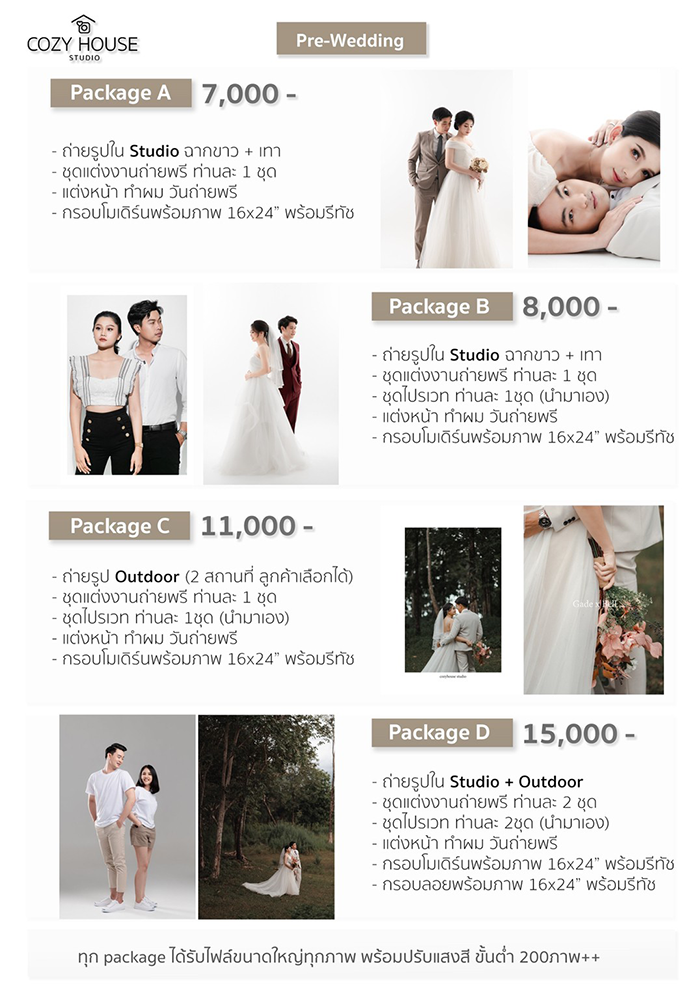 สำหรับแพคเกจการถ่ายภาพ Pre-Wedding กับที่ร้านมีให้เลือกหลายหลายรูปแบบเลยค่ะ ขอยกตัวอย่างให้ดูประกอบกันไปนะคะ