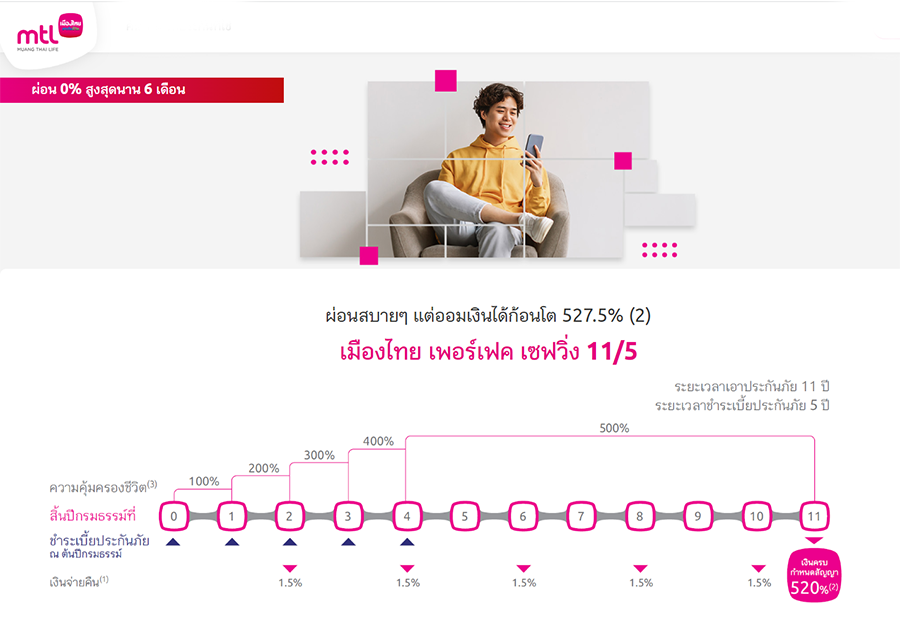 ประกันสะสมทรัพย์ 11/5 ของบริษัทเมืองไทยที่ออกแบบมาขายเฉพาะบนช่องทางออนไลน์ มีการจ่ายเบี้ยทุกปีจำนวน 5 ครั้ง และคุ้มครองชีวิต 11 ปี ได้รับเงินคืนทุกๆ 2 ปี ปีสุดได้เงินคืนครบกำหนดสัญญา