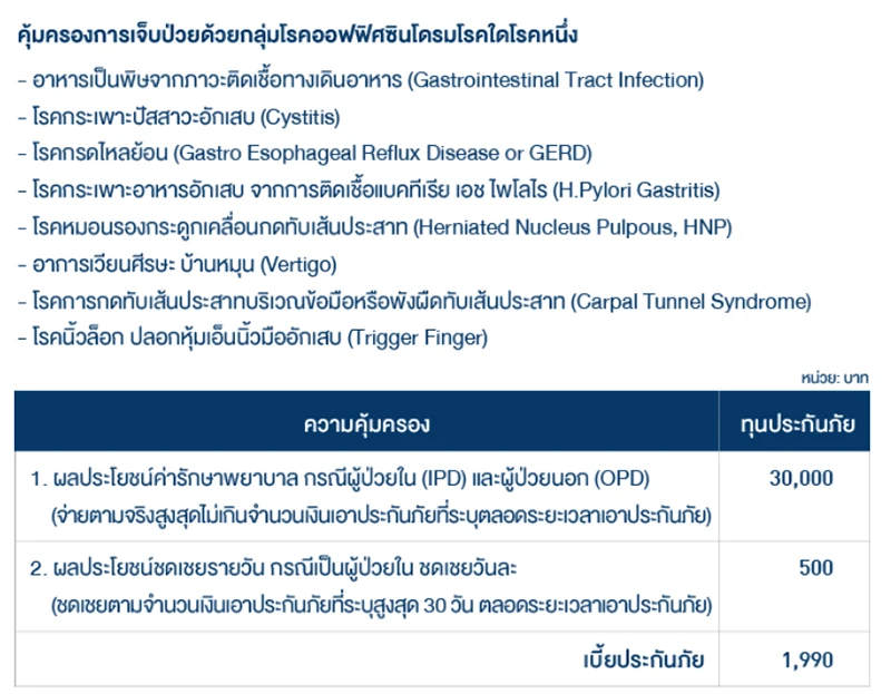- ให้ความคุ้มครองทั้ง IPD และ OPD โรคที่มีสาเหตุจาก Office Syndrome
