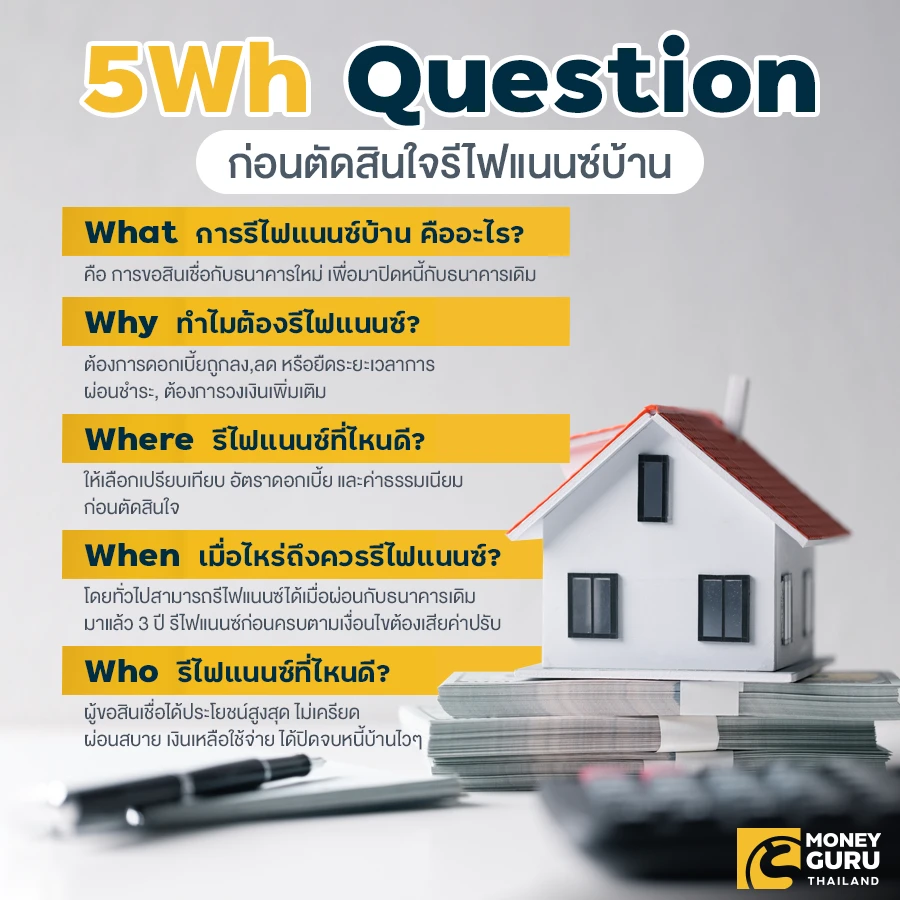 หนี้บ้าน เป็นหนี้ก้อนโตระยะยาวที่ต้องใช้ระยะเวลาผ่อนนาน 20 - 30 ปี คนเป็นหนี้บ้านที่อยากปิดจบภาระหนี้เร็วๆ อยากเป็นเจ้าของบ้านจริงๆ สักที ก็มักจะหาตัวช่วยที่จะทำให้ผ่อนบ้านหมดไวๆ ซึ่ง "การรีไฟแนนซ์บ้าน" ถือเป็นตัวช่วยอันดับหนึ่งที่คนเป็นหนี้บ้านมักเลือกใช้กันค่ะ และวันนี้…ก่อนที่จะตัดสินใจรีไฟแนนซ์บ้านเราจะพามาดู 5W Question ต้องรู้! ว่ามีอะไรบ้าง โดยเฉพาะมือใหม่เรื่องการเป็นหนี้บ้าน ตามมาดูกันเลย…