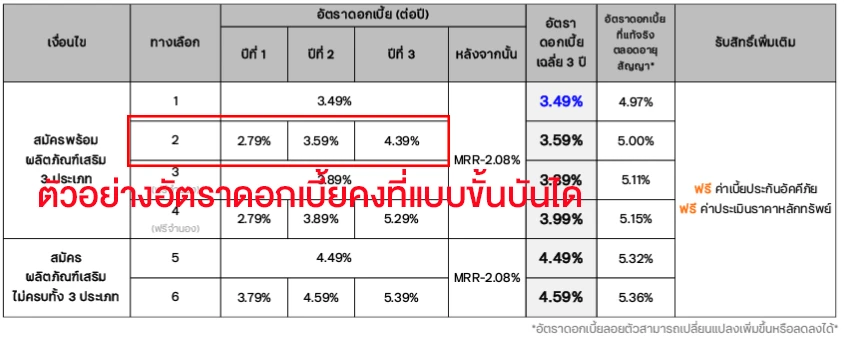 1.3 ดอกเบี้ยคงที่แบบขั้นบันได เป็นอัตราดอกเบี้ยกำหนดให้คงที่ในช่วงระยะเวลาหนึ่ง และจะมีการปรับขึ้นหรือลงเป็นขั้นๆ เช่น ดอกเบี้ยปีแรก 1.99% ปีที่สอง 2.50% ปีที่สาม 3.30% หรือปรับตามช่วงเวลาที่กำหนด เช่น ทุก 1 ปี ทุก 3 ปี หรือทุก 5 ปี หลังจากนั้นจะปรับเป็นอัตราดอกเบี้ยแบบลอยตัว