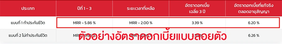 2. อัตราดอกเบี้ยลอยตัว (Floating Rate) คือ อัตราดอกเบี้ยที่มีการปรับเปลี่ยนตามสภาวะตลาดหรืออัตราดอกเบี้ยอ้างอิง เช่น MLR, MRR หรือ MOR ซึ่งอาจจะทำให้ดอกเบี้ยเพิ่มขึ้นหรือลดลง และไม่ได้กำหนดระยะเวลาการปรับดอกเบี้ยที่แน่นอน