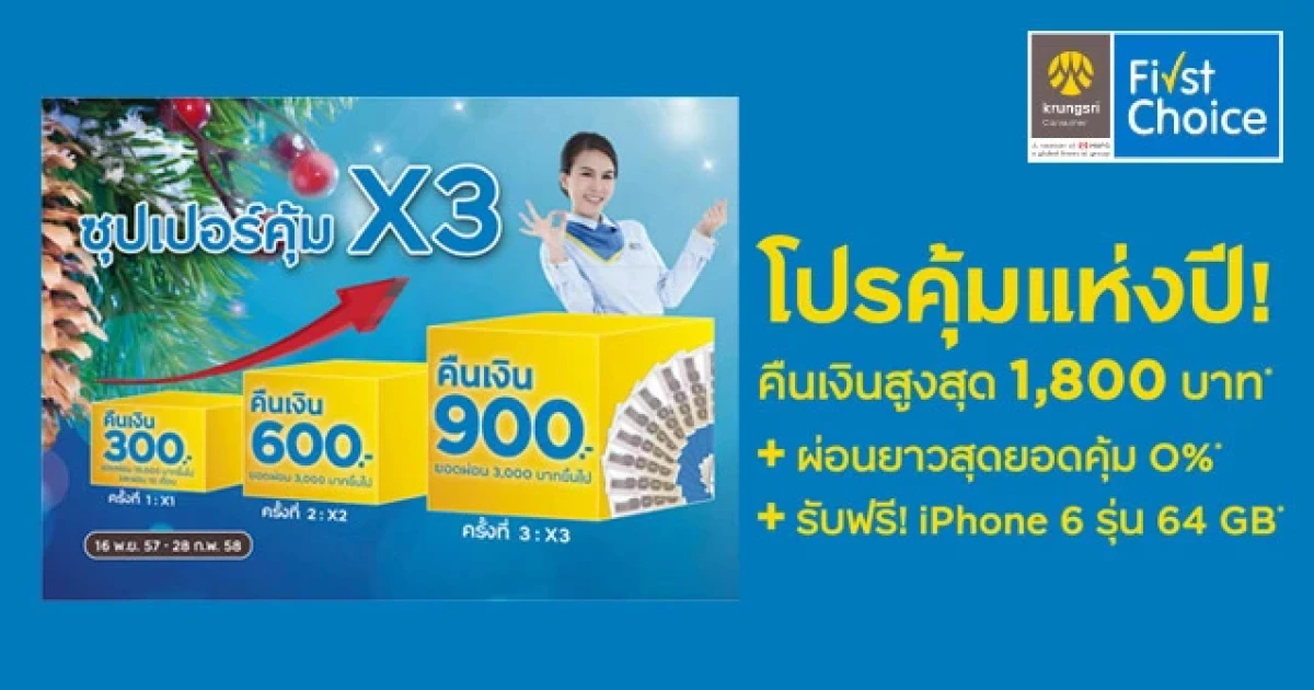 ซุปเปอร์คุ้ม X3 โปรคุ้มแห่งปี! คืนเงินสูงสุด 1,800 บาท จากกรุงศรี เฟิร์สช้อยส์