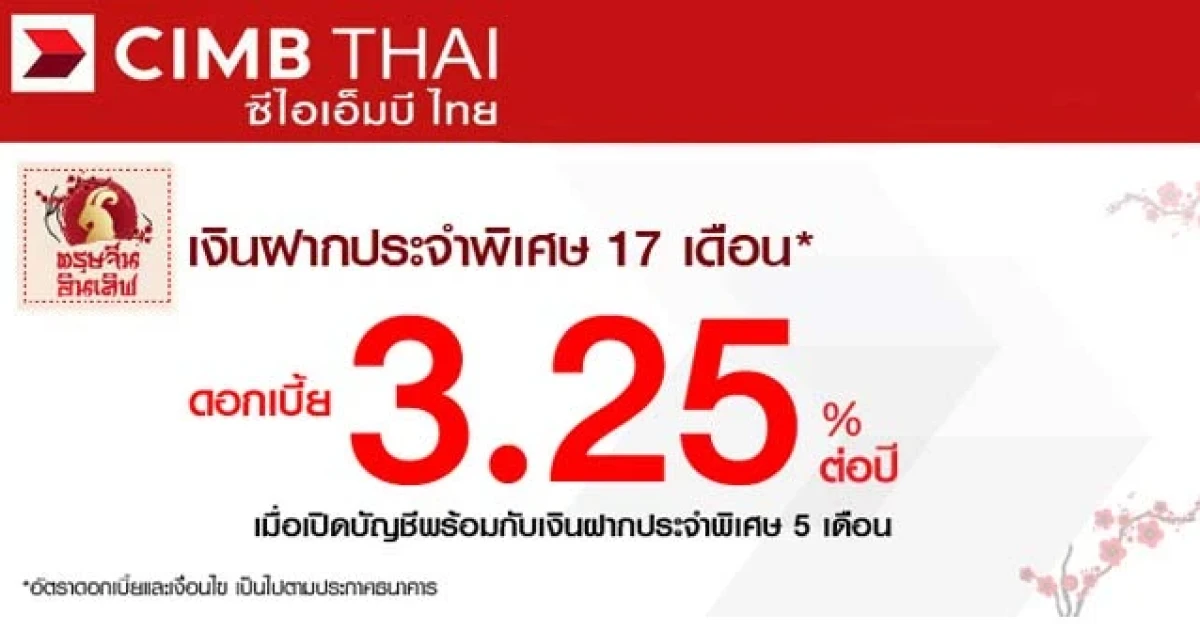 ฝากประจำพิเศษ 17 เดือน ดอกเบี้ยสูง 3.25% ต่อปี กับ CIMB