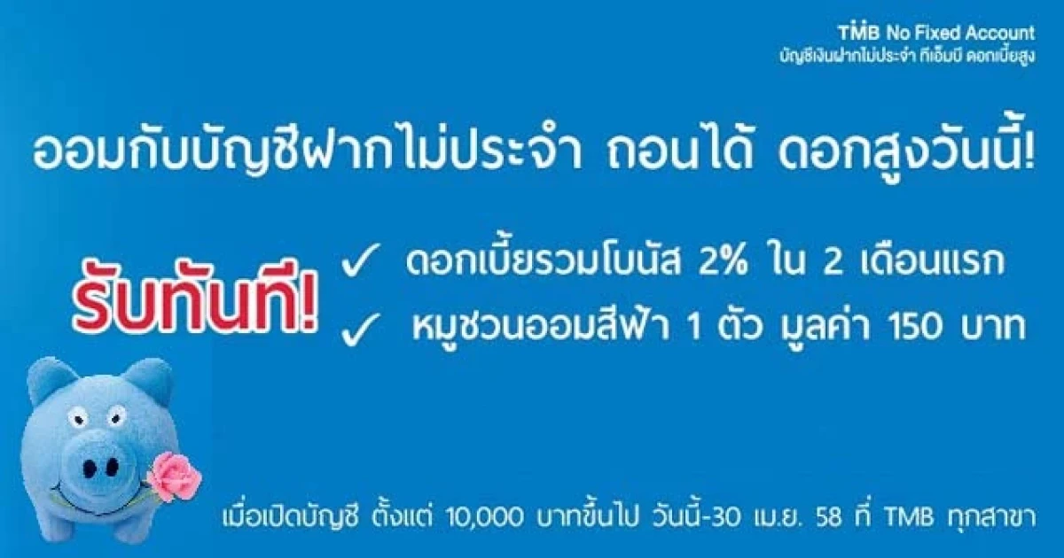 รับทันที! ดอกเบี้ยโบนัส และหมูชวนออม เมื่อเปิดบัญชีฝากไม่ประจำ ทีเอ็มบี
