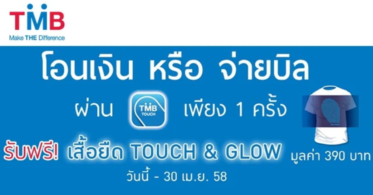 - ลูกค้าจะได้รับเสื้อยืด TOUCH & GLOW เมื่อทำธุรกรรม โอนเงิน / จ่ายบิล / เติมเงิน อย่างใดอย่างหนึ่ง เพียง 1 รายการ ผ่าน TMB Touch Mobile Application ภายใน 30 วัน หลังจากวันที่เปิดบัญชี