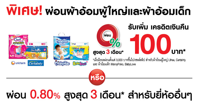 - บริษัทฯ ขอสงวนสิทธิ์ในการเครดิตเงินคืน 100 บาท เมื่อมียอดผ่อนตั้งแต่ 3,000 บาทขึ้นไป/เซลล์สลิป สำหรับผ้าอ้อมผู้ใหญ่ Lifree, Certainty ผ้าอ้อมเด็ก MamyPoko, BabyLove โดยจำกัดการเครดิตเงินคืนสูงสุด 200 บาท/บัญชีบัตรสมาชิก/ตลอดระยะเวลาส่งเสริมการตลาด ทั้งนี้ไม่นับรวมยอดค่าใช้จ่ายที่ถูกยกเลิกและยอดค่าใช้จ่ายที่มีการคืนสินค้าภายหลัง