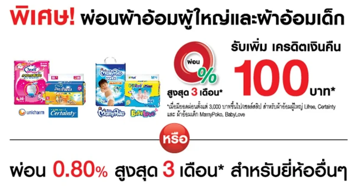 - บริษัทฯ ขอสงวนสิทธิ์ในการเครดิตเงินคืน 100 บาท เมื่อมียอดผ่อนตั้งแต่ 3,000 บาทขึ้นไป/เซลล์สลิป สำหรับผ้าอ้อมผู้ใหญ่ Lifree, Certainty ผ้าอ้อมเด็ก MamyPoko, BabyLove โดยจำกัดการเครดิตเงินคืนสูงสุด 200 บาท/บัญชีบัตรสมาชิก/ตลอดระยะเวลาส่งเสริมการตลาด ทั้งนี้ไม่นับรวมยอดค่าใช้จ่ายที่ถูกยกเลิกและยอดค่าใช้จ่ายที่มีการคืนสินค้าภายหลัง