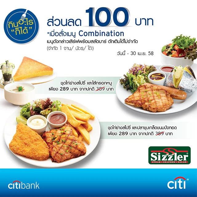 บัตรเครดิตซิตี้แบงก์ เอาใจสมาชิกบัตร โดยร่วมมือกับร้านอาหารซิซซ์เล่อร์ (Sizzler) มอบสิทธิพิเศษสำหรับสมาชิกบัตรซิตี้แบงก์ที่ชื่นชอบอาหารประเภทสเต็ก ซีฟู้ด และสลัดสไตล์ตะวันตก ให้ได้อิ่มอร่อยสุดคุ้มกับแคมเปญ "กินอะไรก็ได้" พร้อมรับส่วนลด 100 บาททันที!! เมื่อสั่งเมนู Combination 2 เมนูสุดฮิต ชุดไก่ย่างสไปซี่และไส้กรอกรวมหมู หรือ ชุดไก่ย่างสไปซี่และปลาชุบเกล็ดขนมปังทอด โดยเมนูดังกล่าวจะเสิร์ฟพร้อมสลัดบาร์ซึ่งตักและเติมได้ไม่จำกัด ในราคา 289 บาท จากปกติ 389 บาท (จำกัด 1 จาน / บัตร / โต๊ะ) ที่ซิซซ์เล่อร์ ทุกสาขา