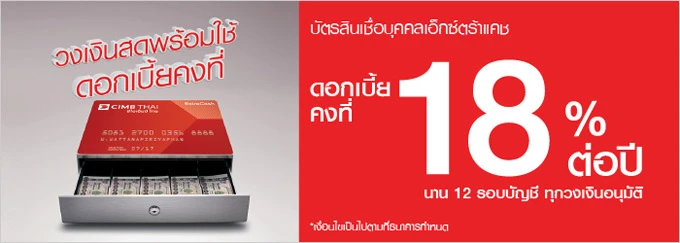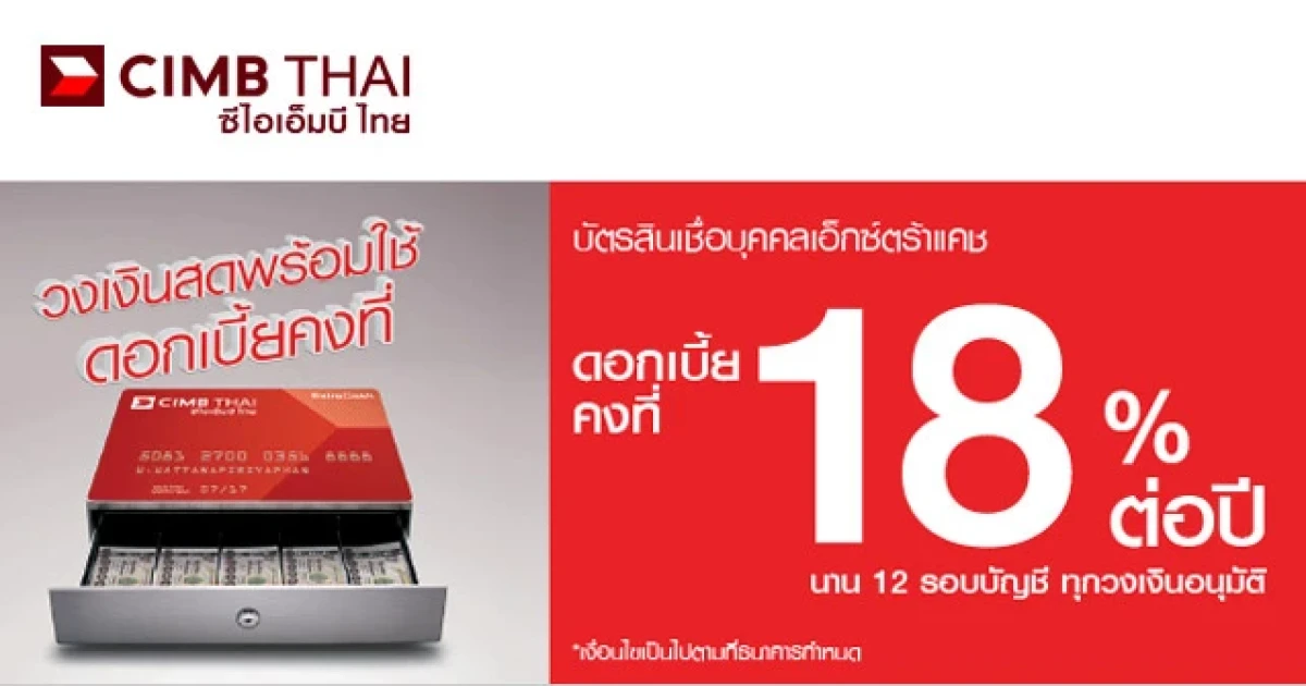 สินเชื่อบุคคลเอ็กซ์ตร้าแคช ดอกเบี้ยพิเศษ 18% ต่อปี จาก CIMB Thai