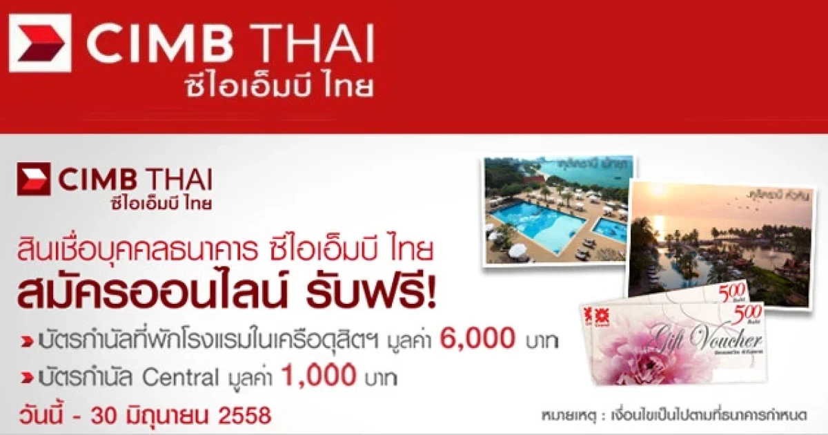 สมัครสินเชื่อออนไลน์กับ CIMB Thai รับฟรี! บัตรกำนัล Central หรือบัตรกำนัลที่พักในเครือดุสิต