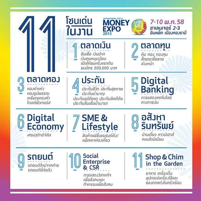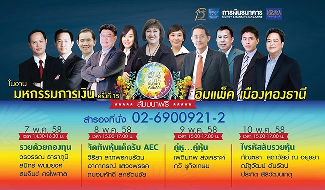 มหกรรมการเงิน ครั้งที่ 15 (MONEY EXPO 2015) จัดระหว่างวันที่ 7 - 10 พฤษภาคม 2558 ณ ชาเลนเจอร์ 2-3 อิมแพ็ค เมืองทองธานี เวลา 10.00 - 21.00 น. (วันที่ 7 เปิดให้เข้าชม 12.00 น.)