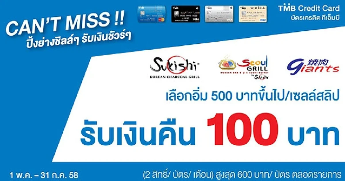 - เมื่อเลือกชำระค่าอาหารและเครื่องดื่มผ่านบัตรเครดิต TMB แค่ 500 บาทขึ้นไป/เซลล์สลิป ที่ร้าน Sukishi Charcoal Grill, Seoul Grill หรือ Giant รับเงินคืน 100 บาท (2 สิทธิ์/บัตร/เดือน สูงสุด 600 บาท/บัตร ตลอดรายการ) คิดจากยอดใช้จ่ายจริงหลังจากหักส่วนลดต่างๆ แล้ว ระหว่างวันที่ 1 พ.ค. - 31 ก.ค. 58