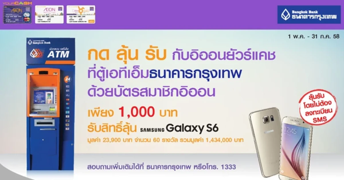 ลูกค้าอิออนยัวร์แคช ที่เบิกเงินผ่านตู้ เอทีเอ็ม ธ.กรุงเทพ (หมายเลขบัตรที่ขึ้นต้นด้วย 5105) เพียง 1,000 บาท รับ 1 สิทธิ์ พิเศษสำหรับลูกค้าที่ถือบัตรสมาชิกอิออนและบัตรสมาชิกอิออนแรบบิท เบิกเงินผ่านตู้ เอทีเอ็ม ธ.กรุงเทพ เพียง 1,000 บาท (หมายเลขบัตรที่ขึ้นต้นด้วย 8588 และ 8589) รับ 2 สิทธิ์เพื่อลุ้นรับโทรศัพท์ ซัมซุง รุ่น กาแลคซี่ เอส 6 32GB มูลค่า 23,900 บาท ทั้งหมด 60 รางวัล รวมมูลค่า 1,434,000 บาท