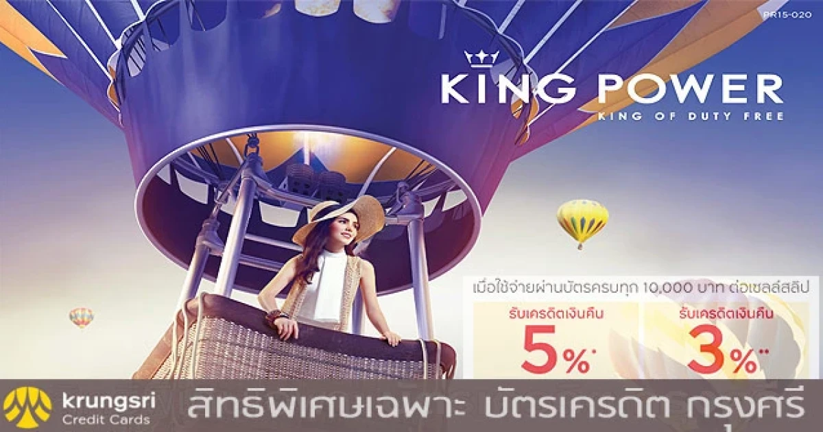 สิทธิพิเศษเฉพาะสมาชิกบัตรเครดิตกรุงศรี ช้อปที่ King Power รับเงินคืน 3-5% เพียงใช้จ่ายผ่านบัตรครบทุกๆ 10,000 บาท ต่อเซลล์สลิป