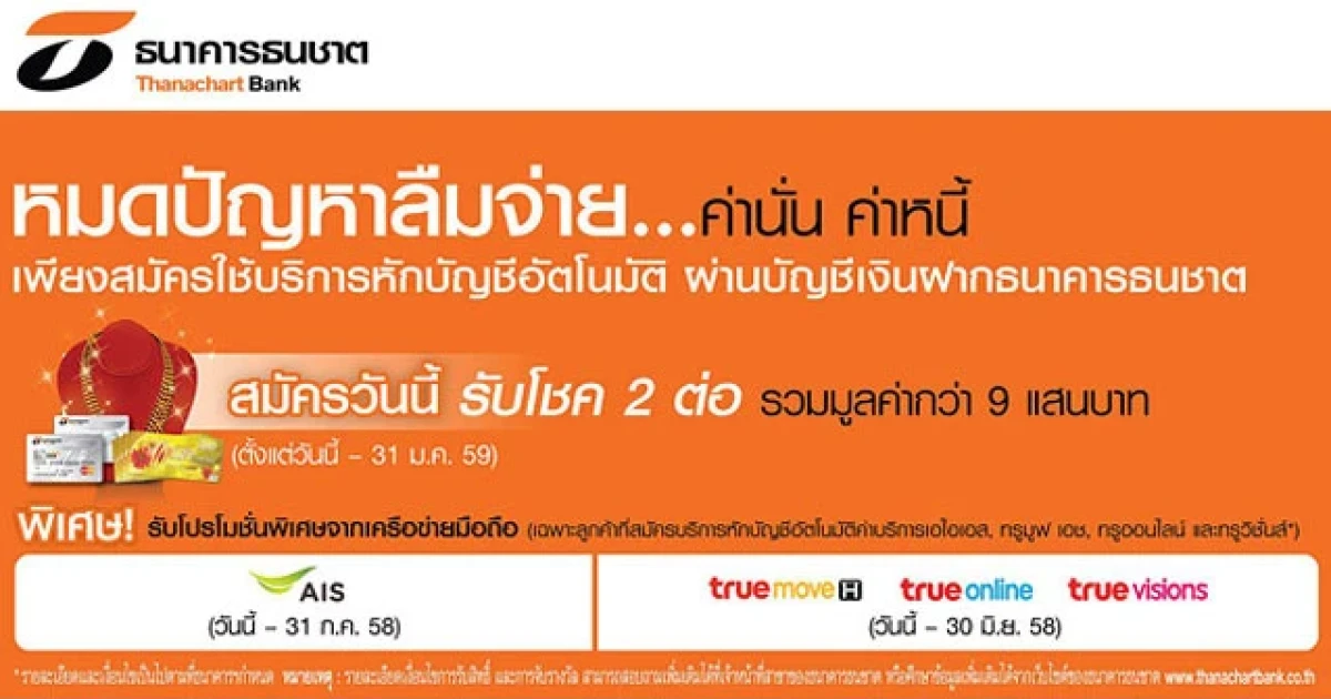 พิเศษ! รับโปรโมชั่นพิเศษจากเครือข่ายมือถือ (เฉพาะลูกค้าที่สมัครบริการหักบัญชีอัตโนมัติ ค่าบริการเอไอเอส, ทรูมูฟ เอช, ทรูออนไลน์ และทรูวิชั่นส์*)