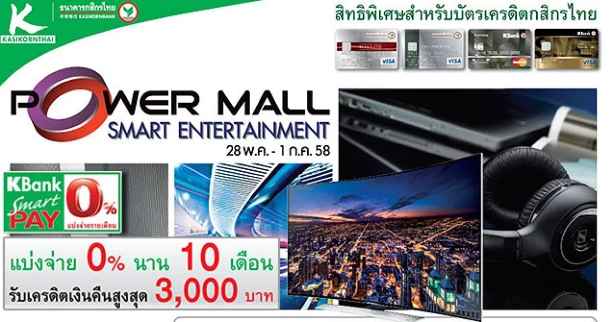 สิทธิพิเศษสำหรับบัตรเครดิตกสิกรไทย แบ่งจ่าย 0% นาน 6-10 เดือน เมื่อซื้อสินค้าที่ POWER MALL SMART ENTERTAINMENT ที่ห้างสรรพสินค้าเดอะมอลล์, เอ็มโพเรียม และพารากอน