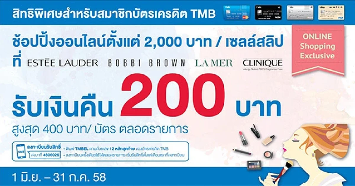สิทธิพิเศษสำหรับสมาชิกบัตรเครดิต TMB ช้อปออนไลน์ที่เว็บไซต์จากแบรนด์เครื่องสำอางชั้นนำ ตั้งแต่ 2,000 บาทขึ้นไป/ เซลล์สลิป รับเครดิตเงินคืนเข้าบัญชีบัตรเครดิต TMB มูลค่า 200 บาท โดยคิดจากยอดใช้จ่ายจริงหลังจากหักส่วนลดต่างๆ แล้ว (สูงสุด 200 บาท / บัตร /เดือน สูงสุด 400/ บัตร ตลอดรายการ)
