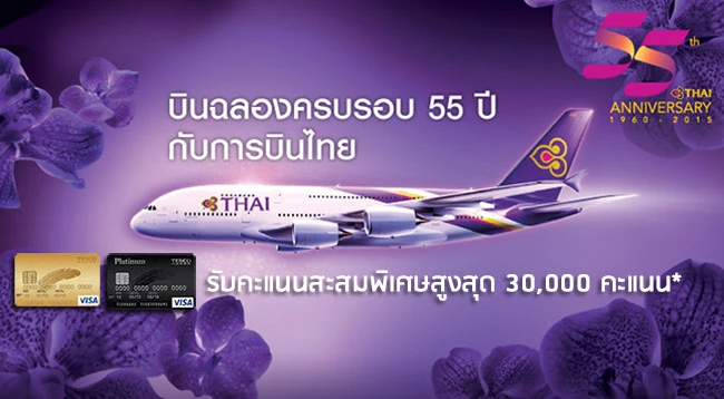 บินฉลองครบรอบ 55 ปี กับการบินไทย สมาชิกบัตรฯ เทสโก้ โลตัส วีซ่า รับคะแนนสะสมพิเศษสูงสุด 30,000 คะแนน เมื่อซื้อบัตรโดยสารของการบินไทย ที่ thaiairways.com