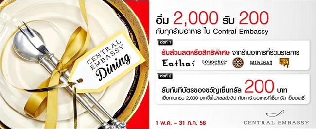 - ต่อที่ 2 รับทันทีบัตรของขวัญเซ็นทรัล 200 บาท เมื่อทานครบ 2,000 บาทขึ้นไป/ เซลล์สลิป กับทุกร้านอาหารที่เซ็นทรัล เอ็มบาสซี่