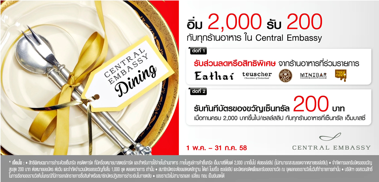 - สิทธิพิเศษเฉพาะการชำระด้วยเซ็นทรัล เครดิตคาร์ด ที่มีเครื่องหมายมาสเตอร์การ์ด และสำหรับการใช้จ่ายในร้านอาหาร ภายในศูนย์การค้าเซ็นทรัล เอ็มบาสซี่ ตั้งแต่ 2,000 บาท/ เซลล์สลิป (ไม่สามารถสะสมยอดจากหลายเซลล์สลิป)