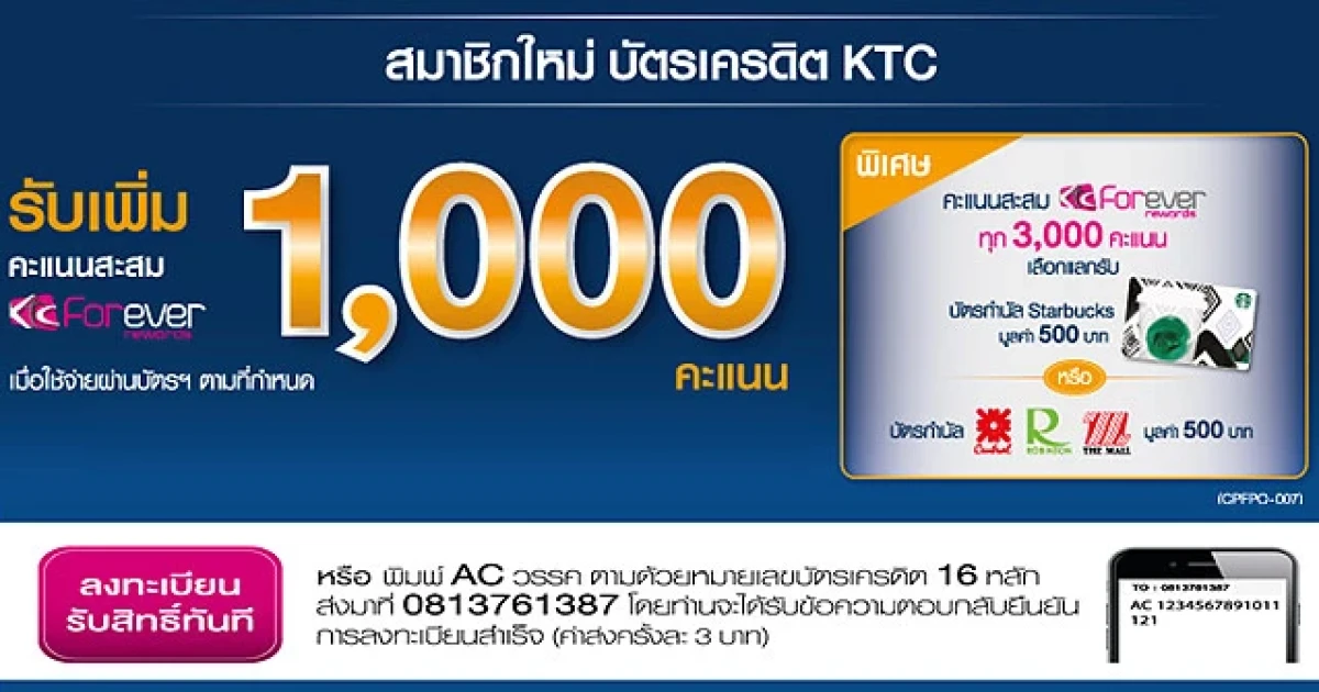 สมาชิกใหม่ บัตรฯ KTC รับเพิ่มคะแนนสะม Forever Rewards 1,000 คะแนน เพียงใช้จ่ายผ่านบัตรฯ อย่างน้อย 2 ครั้งต่อเดือน ติดต่อกัน 3 เดือน (เฉพาะสมาชิกบัตรหลักใหม่ที่สมัคร และได้รับการอนุมัติบัตรฯ ระหว่างวันที่ 1 มิ.ย. - 30 ก.ย. 58 และทำการลงทะเบียนภายใน 90 วันหลังจากได้รับการอนุมัติบัตรฯ)