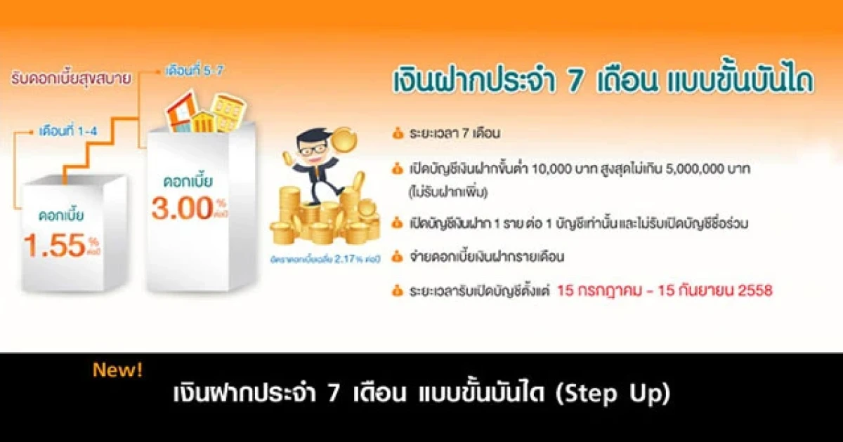 บัญชีเงินฝากประจำ 7 เดือน แบบขั้นบันได (Step Up) สำหรับลูกค้าบุคคลธรรมดา เปิดบัญชีขั้นต่ำ 10,000 บาท รับดอกเบี้ยรายเดือนสบายๆ สูงสุด 3% ต่อปี