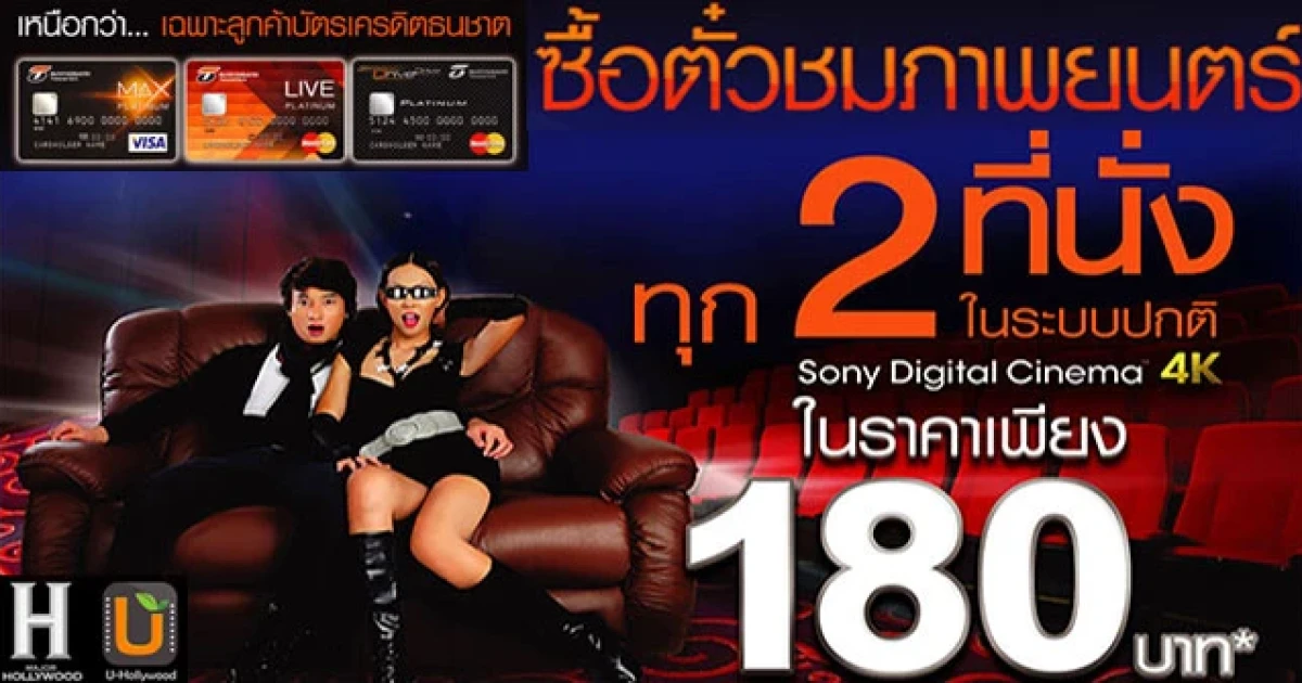 ลูกค้าบัตรเครดิตธนชาต ซื้อตั๋วชมภาพยนตร์ทุก 2 ที่นั่ง ในราคาพิเศษ 180 บาท ทุกรอบ ทุกวัน (จากปกติ 240 - 360 บาท) เมื่อชำระด้วยบัตรเครดิตธนชาต เฉพาะหนังในระบบปกติ Sony Digital Cinema 4K ณ โรงภาพยนตร์ Major Hollywood และ U-Hollywood เฉพาะสาขาที่ร่วมรายการ