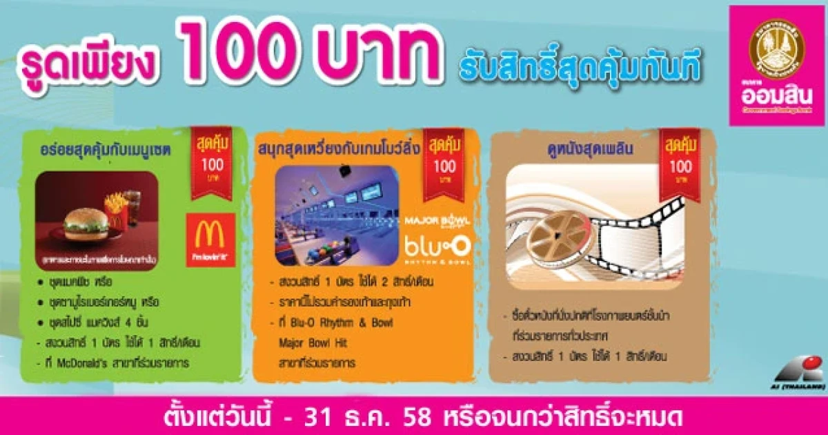 "ยิ่งรูด ยิ่งคุ้ม" เพียงมีบัตรเดบิต ธนาคารออมสิน นำไปรูดเพียง 100 บาท ก็สามารถเลือกรับสิทธิ์สุดคุ้มได้ทันที ตั้งแต่วันนี้ - 31 ธ.ค. 2558 หรือจนกว่าสิทธิ์จะหมด
