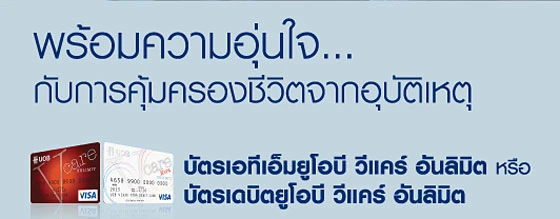 - เงื่อนไขความคุ้มครองอุบัติเหตุของบัตรยูโอบี วีแคร์ รวมถึงค่าธรรมเนียมของบัตรเอทีเอ็ม ยูโอบี วีแคร์ อันลิมิต/เดบิต ยูโอบี วีแคร์ อันลิมิต และ/หรือ เดบิตยูโอบี วีแคร์ เอ็กซ์ตร้า อันลิมิต ให้เป็นไปตามประกาศอัตราค่าธรรมเนียม ณ ขณะนั้น ท่านสามารถตรวจสอบอัตราค่าธรรมเนียมปัจจุบันและสิทธิประโยชน์ของบัตรแต่ละประเภทได้ที่ www.uob.co.th