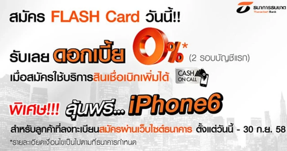 ต่อที่ 2 : ลุ้นรับ iPhone6 เพียงลงทะเบียนสมัครใช้บัตรสินเชื่อบุคคลธนชาต FLASH Card และบริการสินเชื่อเบิกเพิ่มได้ (Cash on Call) ผ่านเว็บไซต์ธนาคาร - 30 ก.ย. 2558 นี้ (ดูเงื่อนไขโปรโมชั่นลุ้นรับ iPhone6 คลิก!)