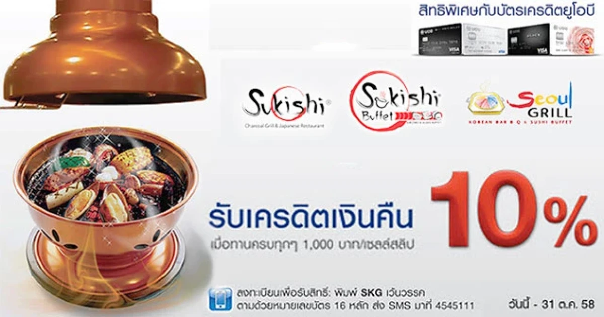 สิทธิพิเศษลูกค้าบัตรเครดิต UOB รับเครดิตเงินคืน 10% เมื่อทานอาหารที่ Sukishi