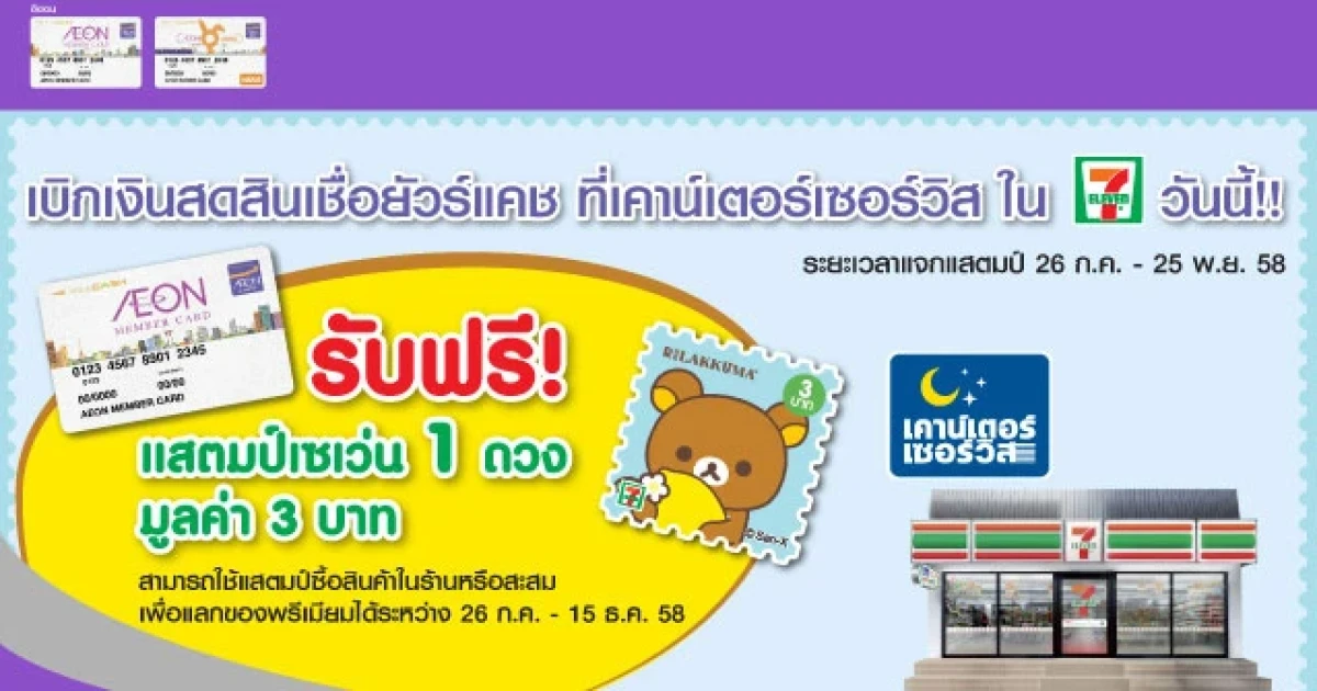 เบิกเงินสดสินเชื่อยัวร์แคช, บัตรสมาชิกอิออน และบัตรสมาชิกอิออนแรบบิท ที่เคาน์เตอร์เซอร์วิส ใน 7-eleven ทุกสาขา วันนี้!! รับฟรี ... แสตมป์เซเว่น 1 ดวง มูลค่า 3 บาท ระยะเวลาแจกแสตมป์ตั้งแต่วันที่ 26 กรกฎาคม - 25 พฤศจิกายน 2558