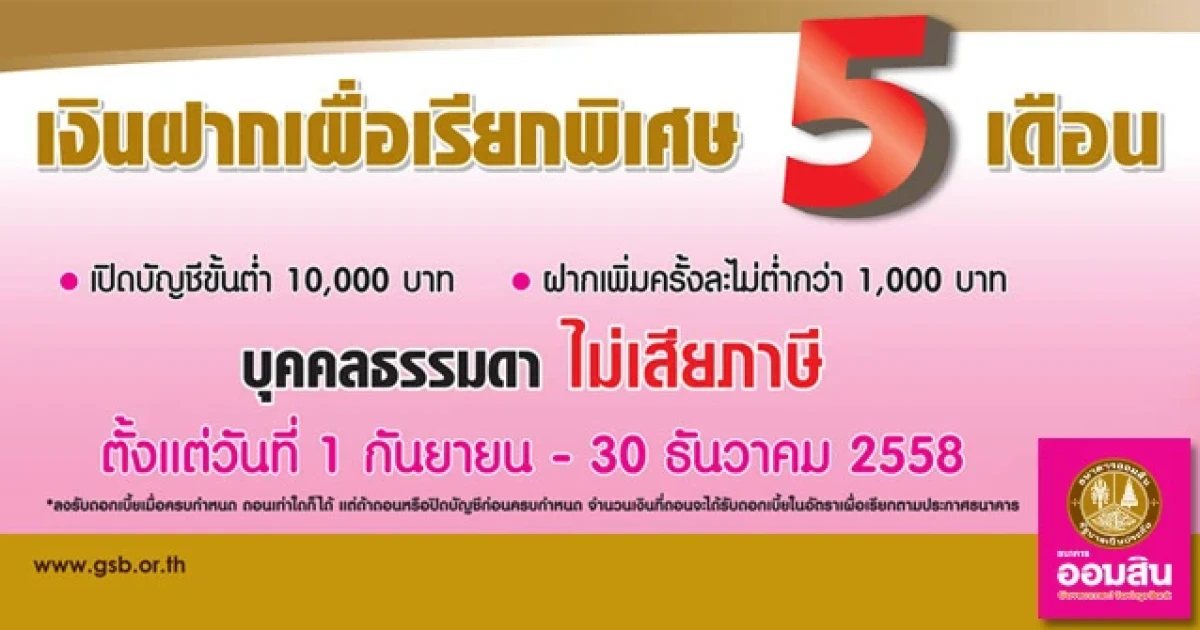 เงินฝากเผื่อเรียกพิเศษ 5 เดือน กับดอกเบี้ยถูกใจ 1.55% ต่อปี จาก ธ.ออมสิน