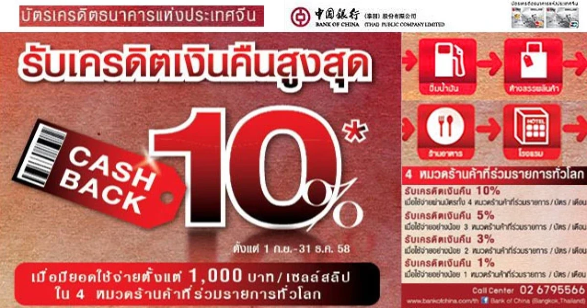 บัตรเครดิตธนาคารแห่งประเทศจีน รับเครดิตเงินคืนสูงสุด 10% (สูงสุด 2,000 บาท/บัตร/เดือน) เมื่อใช้จ่ายผ่านบัตรฯตั้งแต่ 1,000 บาทต่อเซลล์สลิป ครบทั้ง 4 หมวดร้านค้าที่ร่วมรายการ ดังนี้