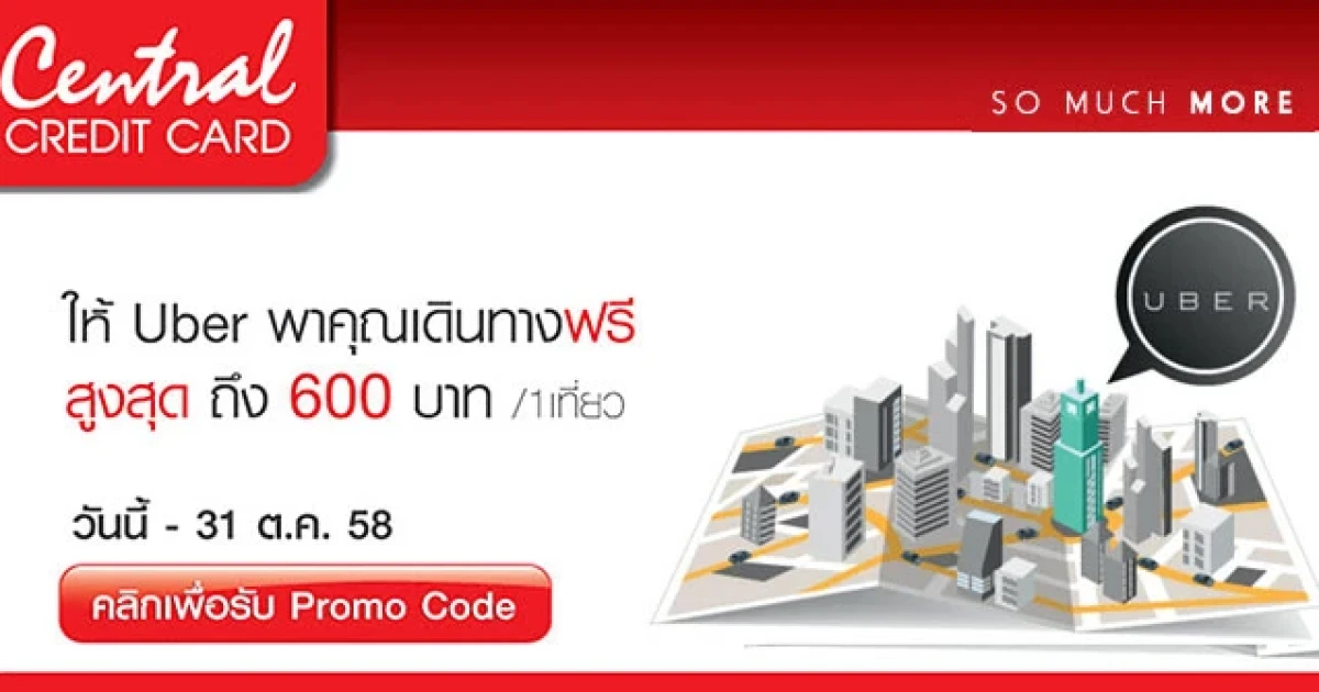 เซ็นทรัล เครดิตคาร์ด ให้ Uber พาคุณเดินทางฟรี สูงสุดถึง 600 บาท/ 1 เที่ยว เพียงพิมพ์รหัส Promo Code เมื่อใช้งานแอปพลิเคชั่น Uber