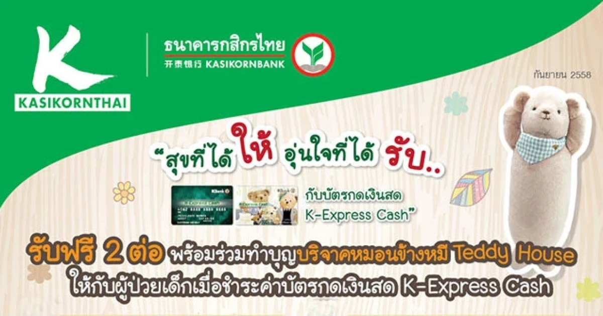 "สุขที่ได้ให้ อุ่นใจที่ได้รับ...กับบัตรกดเงินสด K-Express Cash" รับฟรี 2 ต่อ พร้อมร่วมทำบุญบริจาคหมอนข้างหมี Teddy House ให้กับผู้ป่วยเด็กเมื่อชำระค่าบัตรกดเงินสด K-Express Cash