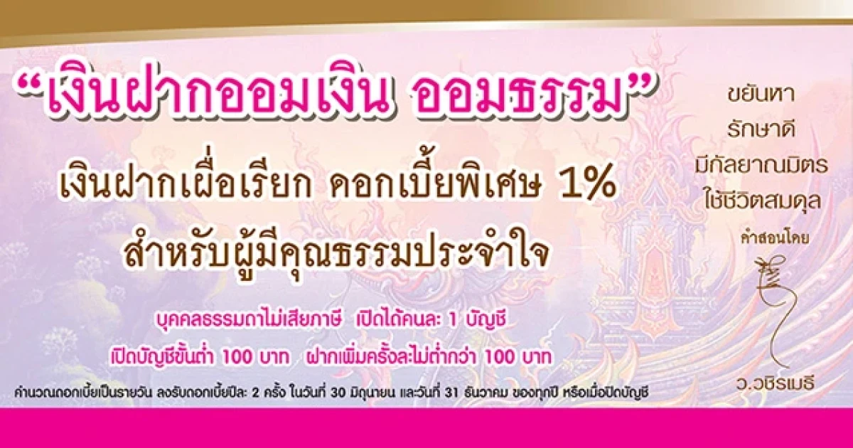 "เงินฝากออมเงิน ออมธรรม" เงินฝากเผื่อเรียก ดอกเบี้ยพิเศษ 1% จาก ธ.ออมสิน