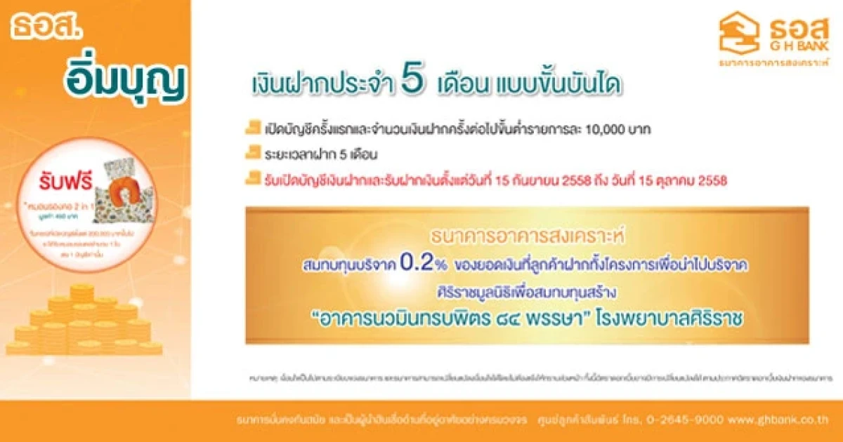 บัญชีเงินฝากประจำ 5 เดือน แบบขั้นบันได ได้ทั้งฝากเงิน ได้ทั้งบุญ โดย ธอส. ร่วมสมทบทุนบริจาค 0.2% ของยอดเงินที่ลูกค้าฝากทั้งโครงการเพื่อนำไปบริจาคศิริราชมูลนิธิ เพื่อสมทบทุนสร้าง "อาคารนวมินทรบพิตร ๘๔ พรรษา" โรงพยาบาลศิริราช