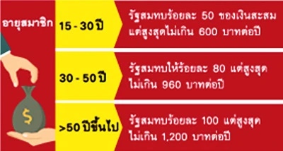การส่งเงินสะสมขั้นต่ำได้ตั้งแต่ 50 บาท แต่เมื่อรวมกันแล้วไม่เกิน 13,200 บาทต่อปี เมื่อสมาชิกส่งเงินสะสม รัฐบาลจะจ่ายเงินสมทบให้ภายในสิ้นเดือนถัดไป ดังนี้