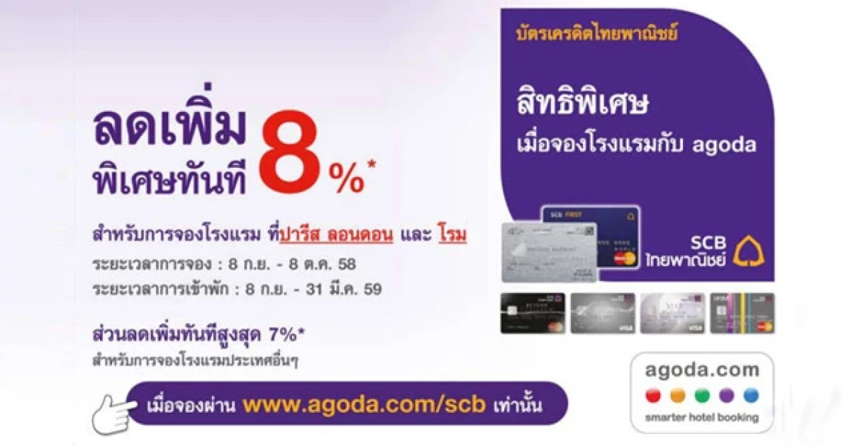 ลูกค้าบัตรฯ SCB รับสิทธิพิเศษเมื่อจองโรงแรมกับ Agoda ผ่านช่องทางออนไลน์ www.agoda.com/scb เท่านั้น