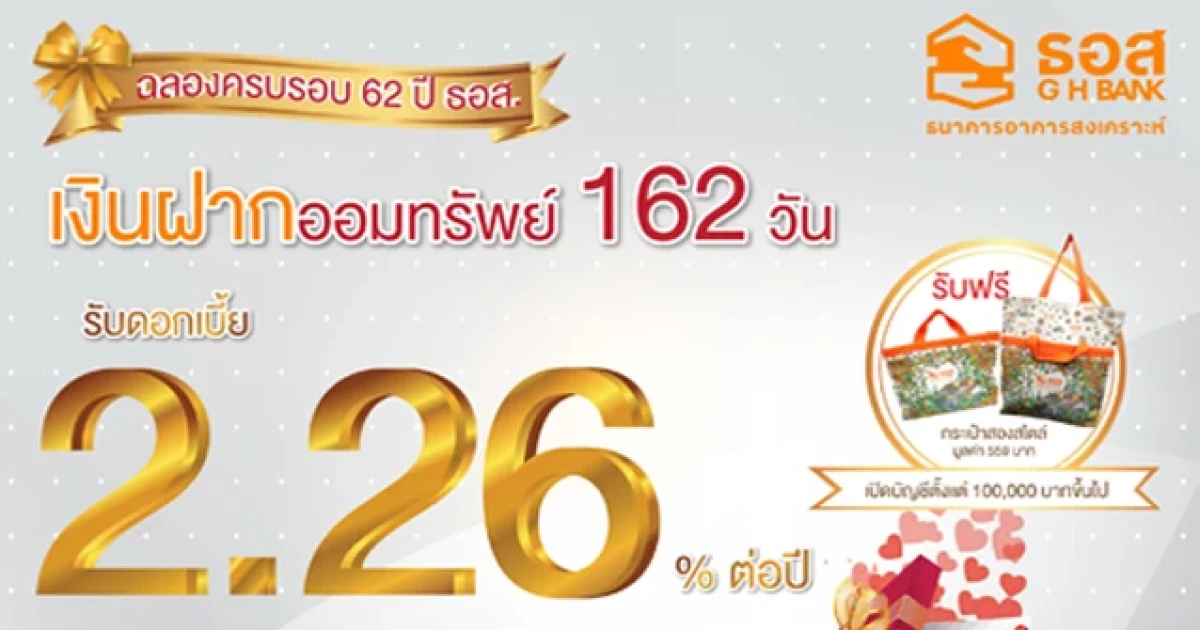 ฉลองครบรอบ 62 ปี กับบัญชีเงินฝากออมทรัพย์ 162 วัน รับดอกเบี้ยสูง 2.26% ต่อปี จาก ธอส.
